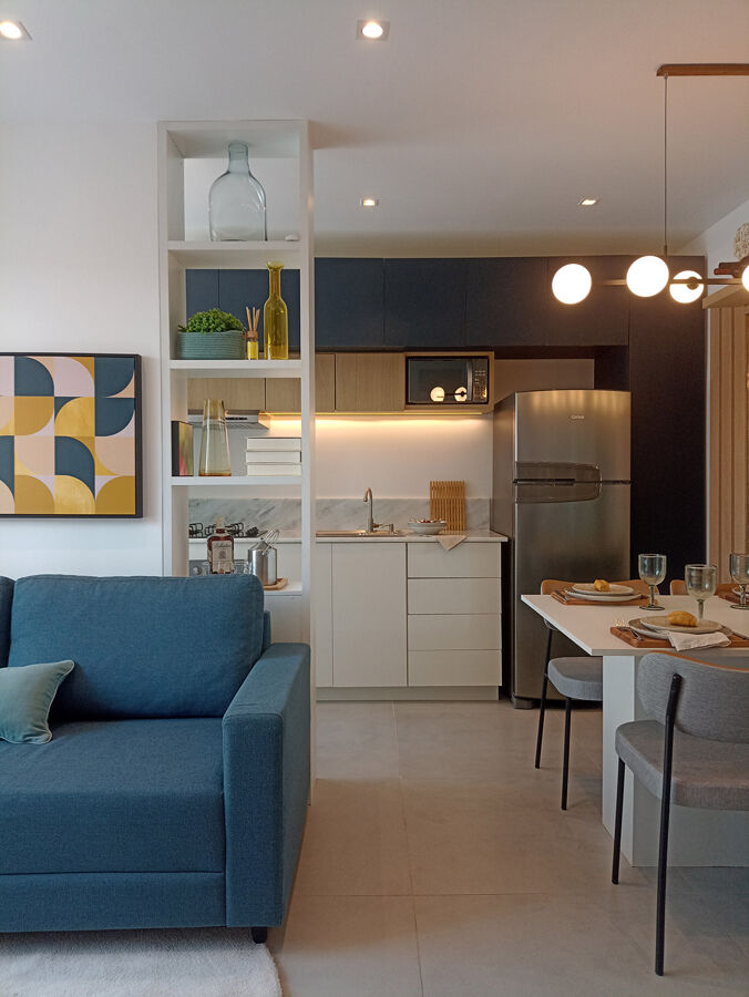 No apartamento decorado do empreendimento Way Parque Central vemos a cor no projeto de cozinha e em alguns detalhes da decoração. Está um encanto!